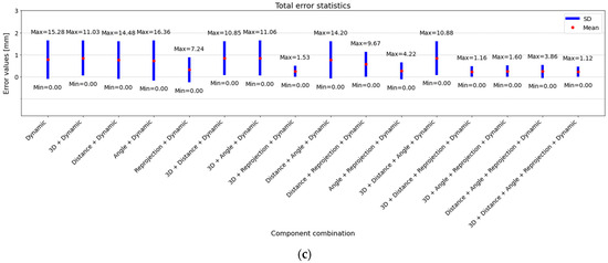 Sensitivity analysis was conducted to evaluate the influence of each error component in the proposed cost function on the final results, focusing on static error statistics, dynamic error statistics, and total error statistics. First, only static error components such as 3D coordinate errors, distance errors, angle errors, and reprojection errors, and their unique combinations without dynamic error components, were analyzed, and the results for static error statistics, dynamic error statistics, and total error statistics are shown in Figure S1. Then, all static error components, dynamic error components, and all their unique combinations were analyzed, and the results for static error statistics, dynamic error statistics, and total error statistics are shown in Figure 4.