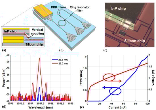 (a) A side-view representation of the schematics for the 3D integrated hybrid silicon laser [], (b) a perspective view of the tunable 3D Silicon Photonics External Cavity Laser (SPECL), featuring two intra-cavity ring resonators [], (c) a close-up of the bonded chip [], (d) the lasing spectra at two distinct current levels near the threshold [], and (e) light–current–voltage (LIV) characteristics for the 3D integrated laser equipped with a micro-ring resonator filter and distributed Bragg reflector (DBR) mirror [].