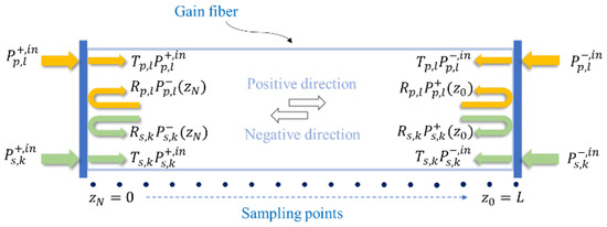 Additionally, boundary conditions must be considered. Depending on the input pump and signal powers in different directions, as well as the transmittance and reflectance at the ends of the doped fiber, the first and last elements of and at the boundaries are rewritten as follows: