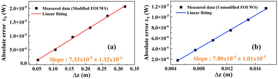 The simulation was conducted using the parameter values listed in Table 1. Figure 2 describes the variation in the error with the size of at time s. This figure clearly shows that the absolute error of the improved FOUWS increases linearly with . This trend indicates that our improved FOUWS, like the unimproved FOUWS (see Figure 2b), remains a first-order method. However, we can also observe that the slope of the improved FOUWS is much smaller than that of the unimproved FOUWS, suggesting that the improved FOUWS is less affected by the number of sampling points, thus providing more accurate results. Moreover, due to its specific precision requirements, the improved FOUWS requires a fewer number of sampling points, which allows for faster computation of the results.