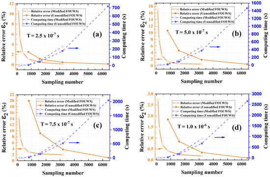 Variations in relative error and computing time versus sampling points for different calculating time spans. (a) s; (b) s; (c) s; (d) s.