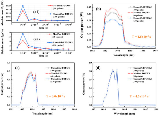 Using the results of the unimproved FOUWS with 400 sampling points as a benchmark for comparison, the total computation time is approximately 21,626 s. In this simulation, the minimum number of sampling points for the unimproved FOUWS is approximately 130, and using fewer sampling points would lead to an unreasonable result. The total computation time for the unimproved method with 130 sampling points is about 1263 s. The improved FOUWS uses 40 sampling points, with a total computation time of 140 s. Figure 4 depicts the errors and forward output spectra for these three sampling computations. Figure 4(a1,a2) show the absolute error and relative error, respectively, between the improved FOUWS (40 sampling points) and the unimproved FOUWS (130 sampling points) against the benchmark (i.e., the unimproved FOUWS with 400 sampling points). This indicates that the improved method (40 sampling points) has a precision that is comparable to or slightly higher than that of the unimproved method (130 sampling points). When the computation time span exceeds 3.0 × 10−5 s, the relative error of the improved method (40 sampling points) is greater than that of the unimproved method (130 sampling points), which is primarily due to the increase in ε2 in the low-power part of the spectrum, where the optical power is close to zero. The improved method still demonstrates good performance in the relatively high-power part of the spectrum, as shown in Figure 4b (1082.5–1084.5 nm) and Figure 4c (1083.0–1084.5 nm), and as the time span increases, the deviation in spectral power tends to become negligible, as shown in Figure 4d.