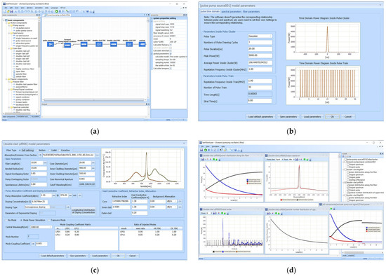 The above simulation processes all involve continuous pump injection. If pulse injection is taken into account, with the influences of different pulse widths, peak powers, and duty cycles, it is inevitable that more finely sampled time and spatial channels will be required. From this perspective, we believe that the advantages of the improved FOUWS over the conventional method are more evident. It is worth noting that the research team has developed a fiber laser simulation software called ‘SeeFiberLaser’ [21], which is currently at version 3.0.3 and incorporates the improved FOUWS algorithm and significantly improves the calculation time. The software can simulate continuous or pulsed fiber oscillators and amplifiers under different time-domain conditions. The software interface is shown in Figure 8a, which can simulate the output pulse characteristics under pulse pump conditions. The pulse parameter settings are shown in Figure 8b, the ytterbium-doped fiber parameters are shown in Figure 8c, and some simulation results are shown in Figure 8d.