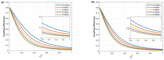 Relationship of change between scintillation index and fiber coupling efficiency. (a) Link distance L = 3000 m. (b) Link distance L = 12,000 m.