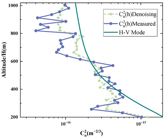 Seasonally and diurnally varying atmospheric conditions also affect at different altitudes, and the experiments were carried out under weak and medium turbulence weather from nighttime in winter to early morning the following day. The wind speed in the H-V model is set to a typical value of 21 m/s, and is set to a typical value of at night. Figure 4 shows the results of the actual measurement and the denoising measurement compared with the H-V model [21].