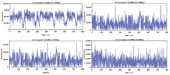 Since the tethered blimp is only suitable for working in the near-ground altitude range, in order to ensure the smooth progress of the on-board laser communication experiment, the blimp was lifted to a height of 1000 m. Six communication experiments between the airship and the ground were carried out under the weak and medium turbulence weather from 8:00 pm to 5:00 am the next morning in winter. The test link is shown in Figure 3, where firstly, the scintillation index and fiber coupling efficiency were measured for a link distance (L) of 3000 m, and secondly, the scintillation index and fiber coupling efficiency were measured for a link distance of 12,000 m for a blimp descending from 1000 m to 600 m. The communication mode and related system parameters are the same as in Table 1, the actual received photocurrent values measured in 800 s are shown in Figure 5, and the scintillation index measurements are shown in Table 2.