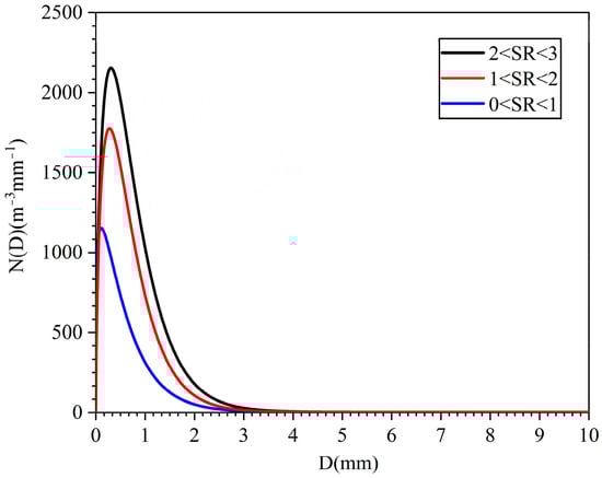 Ranting Tao et al. [14] obtained the PSD curves of snow in the range of three snowfall rates (SRs) (mm/h) by using data measured by a 2-DVD and fitted the PSD curves to obtain the snow particle size distribution model, as shown in Figure 1: