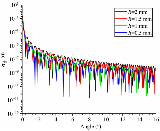 Figure 3 shows the distribution of the Fraunhofer diffraction differential scattering attenuation cross-section when the wavelength of the laser beam is 905 nm and the radius of the snow particles is R = 0.5 mm, 1 mm, 1.5 mm, or 2 mm.