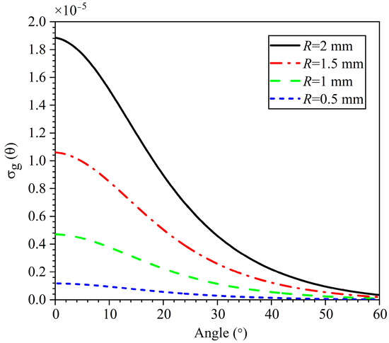 Figure 5 shows the distribution of differential scattering attenuation cross-sections for geometrical optical scattering when the wavelength of the laser beam is 905 nm and the radius of the snow particles is R = 0.5 mm, R = 1 mm, R = 1.5 mm, or R = 2 mm.