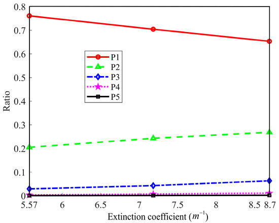 Figure 7 shows the variation curves of the ratio of each scattered photon to the total received photons when the laser transmits 50 m in a snowfall environment simulated by using the Monte Carlo model, and P1–P5 represents the ratios of one to five scattered photons to the total received photons, respectively. As can be seen from the figure, the number of photons undergoing multiple scattering increases with the increase of the extinction coefficient, and the fourth and fifth scattering account for a small proportion of the multiple scattering, so the effect of the first three scatterings needs to be considered in the study of attenuation of laser transmission in snowfall environments. In this paper, the influence of multiple scattering effects on the attenuation process is considered by introducing a forward correction coefficient.