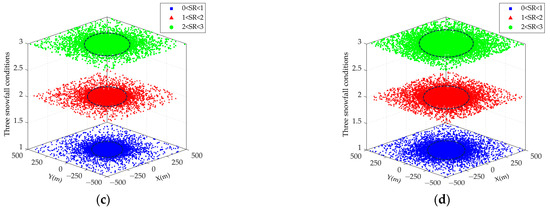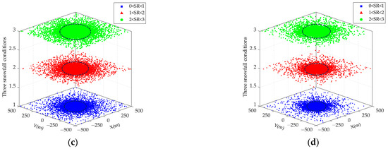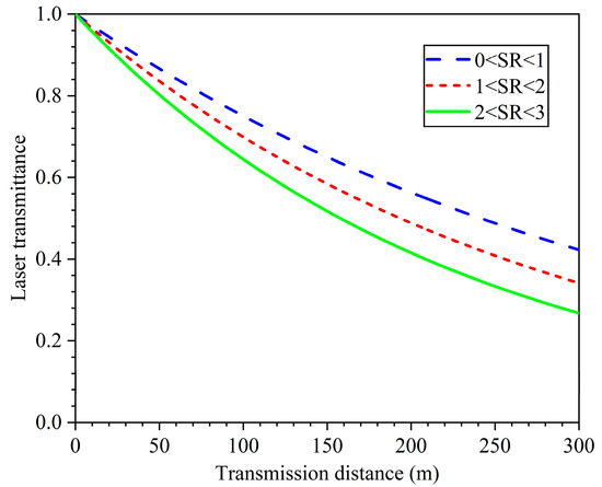 Figure 8 shows the relationship between laser transmittance and transmission distance in different SR ranges. From the figure, it can be seen that, when SR is certain, the transmittance decreases with the increase in transmission distance; when the transmission distance is certain, the transmittance decreases with the increase in SR. Therefore, under the requirement of certain laser transmittance, the applicable detection distance of the laser detection system in a snowfall environment with different SR is different.