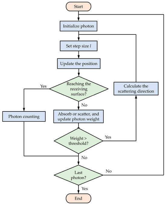 In this paper, the Monte Carlo method was used to study the influence of snowfall on the power attenuation characteristics and spot expansion characteristics of laser beams. Figure 9 indicates the basic flowchart for photon tracing using the Monte Carlo method, as follows. Assuming that the receiving surface is infinite and centered on the z-axis, the emitting light source is a collimated laser beam, the initial weight of the photon is , the initial position is , and the initial direction of motion is , the random step of the photon between two neighboring collisions is [21,22]: