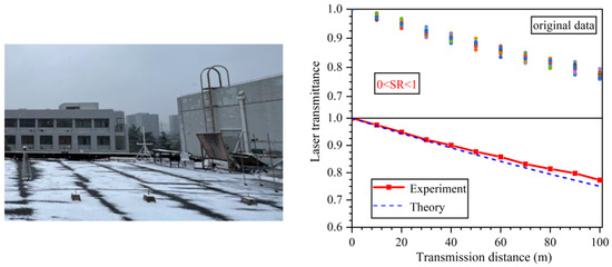 In addition, due to the limitation of snowfall time, only 15 measurement experiments were carried out for each receiving surface position under the three snowfall environments. The small number of experiments increases experimental measurement error, which could make the experimental results deviate from the theoretical values. The measurement experiments were carried out outdoors at Nanjing University of Science and Technology (NUST), and there are many uncontrollable factors in the measurement environment, such as air quality changes and temperature changes. These uncontrollable factors increase the scattering sources in the measurement environment, which led to the experimental value of laser transmittance being larger than the theoretical value.