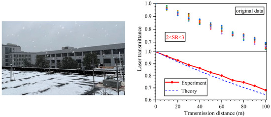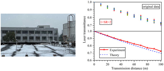 Following the experimental principles to build the outdoor experimental platform shown in Figure 15a, an FU905AD100-GD1670 laser was selected, and the output wavelength was set to 905 nm. Three snowfall scenarios of 0 < SR < 1, 1 < SR < 2, and 2 < SR < 3 occurred on 18 December 2023 at 7:00, 11:00, and 14:00, respectively. To accurately measure the relationship between laser transmittance and transmission distance in the snowfall environment, the three snowfall experiments were carried out by adjusting the position of the transmitting end to set the transmission distance from 10 m to 100 m in steps of 10 m for 10 experiments, as shown in Figure 15b. To reduce experimental error caused by uncontrollable factors, 15 measurement experiments were performed that corresponded to each receiving surface position. The average value of the 15 measurements was taken as the experimental value.