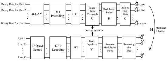where is a matrix with elements, which contains the concatenated signals in one OFDM frame from the K LEDs. represents the spacetime coding matrix generated by the SVD of the channel. The matrix represents the intended data for all the K users, which is described as