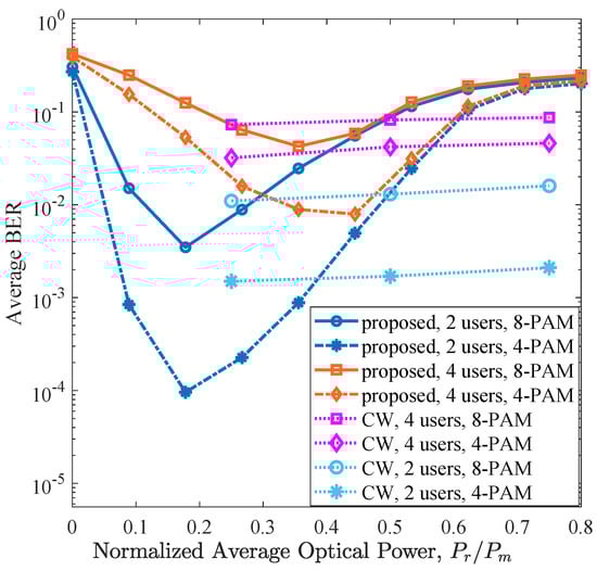 Figure 6 shows the average BER performance at different illumination levels for systems supporting two and four users. In this result, we optimize and to satisfy the illumination requirements while fairly minimizing the BER over the users. For the two-user case shown in Figure 6, the average BER improves as the required illumination level increases because the signal power also increases. As the illumination requirement continues to increase, the performance begins to degrade. For higher illumination requirements, a larger bias is needed, and the interference introduced by this bias affects the system’s performance. A similar phenomenon can be seen in the figure for the four-user case. The four-user case can achieve higher illuminance than the two-user case for the same average BER. This occurs because the MAI in the four-user case is larger than in the two-user case, and the interference introduced by the larger added bias can be used to dominate the interference plus noise.