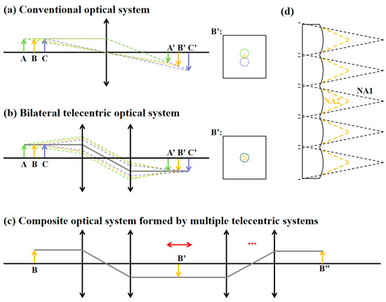 - Illumination Optical Path Module: The telecentric dot-array light is reflected by a polarization beam splitter (PBS) and directed into a 4f system consisting of two scanning lenses. This system produces an image of a telecentric dot array behind scanning lens 2 (as depicted in Figure 3, as a virtual array). An X-axis scanning mirror is positioned at the minimum beam spot between the two scanning lenses. After passing through a quarter-wave plate, a tube lens, and an objective lens, a reduced dot array is formed that illuminates the sample.