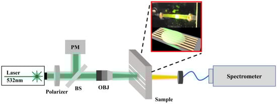Schematic of the experimental setup. BS, beam splitter. PM, power meter. OBJ, objective. The green lines represent the pump light trajectory, while the portion of the laser output received by the spectrometer (the upper half of the inset within the red box is the actual image of the sample, and the lower half is a schematic diagram for sample).