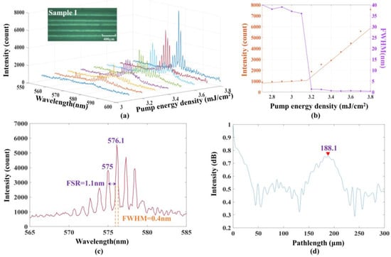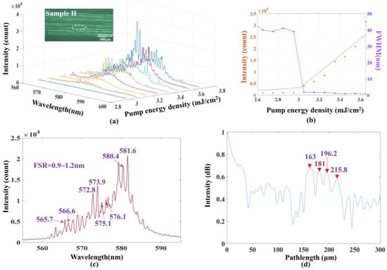 The flexible optical fibers are arranged into a transverse array with an average center-to-center spacing of 150 μm (i.e., sample I in the inset of Figure 2a). The average spacing is greater than . Figure 2a shows that sample I exhibits the fluorescence spectrum of spontaneous emission at low pump power. As the pump power increases, evenly spaced sharp peaks gradually appear in the spectrum, which is a typical characteristic of WGM lasing. Figure 2b presents the output power (orange-colored) and linewidth (purple-colored) of the laser as a function of pump power. With the increase in pump power, the output power initially grows slowly but later rises rapidly, while the full width at half maximum (FWHM) of the output spectrum decreases quickly from 35 nm and maintains below 1 nm. This indicates that the threshold for stable WGM output is 3.15 mJ/cm2. Additionally, the WGM spectrum is analyzed at a pump energy of 3.7 mJ/cm2 in Figure 2c. The center wavelength is 576 nm, and the FSR is 1.1 nm. The theoretical value of the FSR is nm ( nm is the resonance wavelength, μm is the diameter of the micropillar, and is the effective refractive index) [44], which agrees well with the experimental results. Furthermore, Figure 2d shows the power Fourier transform (PFT) [45] of the output spectrum at a pump energy of 3.7 mJ/cm2. The PFT exhibits a distinct peak at 188.1 μm, corresponding to the characteristic cavity length ( μm) of the WGM output.