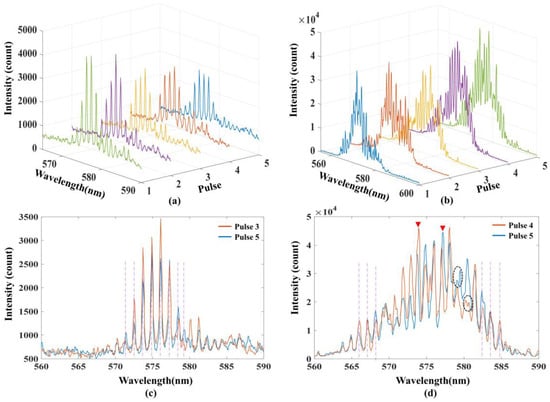 A stability analysis of the laser output under the two different emission regimes is performed. Using the same pump power, multiple pulses are applied to the same sample, and the excitation spectra of sample I and sample II are sequentially recorded shot-by-shot. The output spectral envelope of sample I formed by wide-spread fibers remains stable across different pulses, with the mode emission position unchanged, as shown in Figure 4a,c. In contrast, the output spectral envelope of sample II formed by narrow-spread fibers exhibits significant random fluctuations, with the mode emission position almost unchanged, as shown in Figure 4b,d. The photodegradation effect of the gain solution in sample I is observed [46,47], which causes a slight decrease in output intensity with increasing pump cycles. However, this phenomenon is not evident in sample II. This is attributed to regular WGM corresponding to only a few relatively fixed resonant modes, and the dye molecules along these paths undergoing relatively more cycles of energy absorption and release, which results in a more pronounced photodegradation effect. In contrast, each pulse excites random WGM with significant variation, meaning that each pulse activates resonant modes along different paths. This leads to a wider range of dye molecules participating in the resonance, thereby alleviating the photodegradation effect. This reflects that random WGMs can utilize the gain medium more efficiently. In Figure 4c, the two output spectra under different pump periods are highly overlapped and exhibit a relatively low spectral baseline, indicating a stable and pure WGM emission. In contrast, Figure 4d shows that the peak position of R-WGM lasing under different pump periods slightly diverge (wavelength shift of less than 0.4 nm is observed), as marked by triangles and the dashed box. The slight wavelength shifts are responsible for the non-constant FSR of the R-WGM, as shown in Figure 3c.