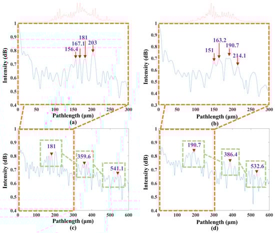 The PFT corresponding to different R-WGM output spectra are investigated in Figure 5a,b. By combining Figure 3d, it can be observed that the laser path of the R-WGM is no longer fixed around the flexible fiber’s circumference under different pulses, but instead follows multiple random paths, corresponding to several equivalent cavity lengths that randomly deviate from the standard cavity length of 188.5 μm. We infer that this is due to the proximity of the flexible fiber, where the evanescent fields (the maximum penetration depth is 81 μm) of different WGM modes couple with each other, leading to significant field injection and leakage between degenerate WGM modes. This further promotes the excitation of specific modes corresponding to specific paths, which exhibit a gain advantage. Additionally, the more compact fiber microcavity structure results in the excitation of new WGM modes corresponding to new paths between adjacent fiber walls (manifesting as instability in the FSR and cavity length), thus exhibiting the multi-peak phenomenon in the PFT. In Figure 5c,d, the peaks corresponding to the fundamental, second, and third standard pathlength (approximately 180 μm, 360 μm, and 520 μm) are observed in the PFT spectrum, and the corresponding intensities decrease as the pathlength increases. Interestingly, around the integer multiples of the standard pathlength, there are several peaks with intensities noticeably higher than the surrounding ones, forming “pathlength bands” in clusters (green dashed line). This further suggests that random WGM lasing results from a combination of various complex mechanisms.