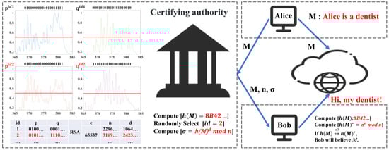 Based on the advantages mentioned above, we designed a simple RSA authentication application based on the R-WGM, as shown in Figure 6. The Certifying Authority (denoted as ) collects the spectrum output from the R-WGM laser and quantizes it into binary bits according to a specified amplitude threshold. groups the generated bitstream into pairs, denoted as and , where indicates the group index. selects the public key (the default constant of the algorithm) and publishes it. Using the RSA algorithm, generates the corresponding modulus and private key for each group using , , and [48]. When Alice wants to prove the reliability of the message (e.g., “Alice is a dentist”) sent to Bob, she seeks certification from (a trusted third party for Alice and Bob). Alice sends the message to . Upon receiving , randomly selects an , such as , from its groups. Due to the one-way and compressive nature of hash functions, typically only the hash of the message is signed. Therefore, computes the hash value (e.g., “8B42…”) and signs it with the private key as , and subsequently publishes the signature . Upon receiving the signature , Bob calculates using the public key . If , Bob believes that has authenticated the message (“Alice is a dentist”).