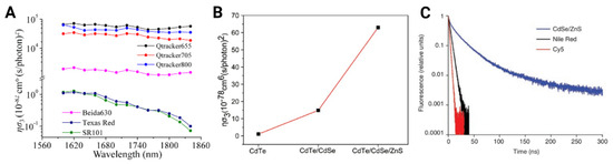 Optical properties of various fluorophores used in deep brain imaging. (A) Comparison of absorption crosssection (ησ3) for commercial QDs (Qtracker) and traditional dyes (Texas Red and SR101) across wavelength 1600 to 1840 nm. Adapted from [25]. (B) ησ3 for lab-created CdTe QDs, showing increased values with additional shell layers (CdSe, CdSe/ZnS) under 1600 nm excitation. Adapted from [36]. (C) Fluorescence decay comparison between common fluorophores and CdSe/ZnS QDs. Cy5 and Nile Red exhibit mono-exponential decays with lifetimes of 1.5 ns and 3.6 ns, respectively, while QD displays multi-exponential decay with mean lifetime of 10.3 ns, demonstrating significantly longer fluorescence duration. Adapted from [34].