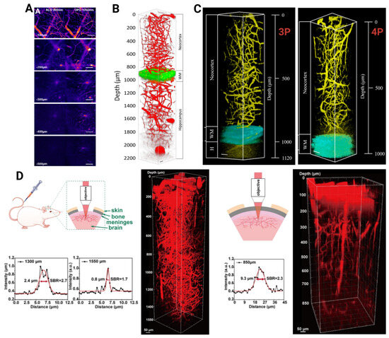 QDs have propelled advancements in MPM, demonstrating effective use in structural imaging through 2 PFM [33,44], 3 PFM [5,24,25,26,27,45], and 4 PFM [24] modalities for in vivo visualization of mouse brain vasculature (Figure 2). These applications leverage the QDs’ superior brightness, larger absorption cross-sections, and use of longer excitation wavelengths (e.g., 1700 nm to 2200 nm) [46,47], which minimizes scattering and optimizes signal retention [1,2,48], allowing for deeper imaging while maintaining high SBR ratios [46].