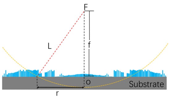 where ϕ is the phase distribution, r is the radial coordinate representing the distance from the center of the metalens to the center of any meta-atom, ω is the angular frequency corresponding to the incident wavelength, c is the speed of light, and f is the focal length of the designed metalens. For an achromatic metalens, it is necessary to satisfy Equation (1) across different light wave frequencies in order to achieve broadband achromatic functionality, as shown in Figure 1. In the metalens, the smallest meta-atom for phase control is a variety of subwavelength structure meta-atoms. The phase shift provided by a single meta-atom can be expressed as [11]: