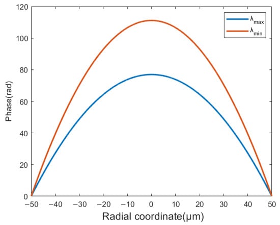 In order to achieve broadband achromatic functionality, the reference phase and the compensating phase need to be satisfied simultaneously within the broadband range. Assuming the highest frequency is ωmax and the lowest frequency is ωmin, as shown in Figure 2, then all frequencies within the interval [ωmin, ωmax] must satisfy ϕ(r, ω)and the corresponding compensating phase ∆ϕ(r, ω).
