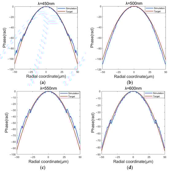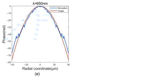 Each meta-atom’s geometrical structure consists of high-low pillars, where in the height of the high pillars is 1900 nm, and the height of the low pillars is 50 nm. The radii of the meta-atoms are designed to range from 90 nm to 270 nm, with a uniform distribution in 20 nm increments, leading to a total of 10 different radii (r = 90 nm, 110 nm, 130 nm, 150 nm, 170 nm, 190 nm, 210 nm, 230 nm, 250 nm, and 270 nm). The meta-atoms are randomly arranged within a square lattice, occupying a square region of 100 μm × 100 μm. As the height of the meta-atom increases, its corresponding optical path length also increases, thus affecting the total phase response generated by the meta-atom. The resultant phase of the meta-atom is dictated by the interplay of the geometrical structure, including the radius and height of the pillars. Corrected phase distribution at discrete wavelengths and the actual phase distribution of the de-signed metalens structure. as shown in Figure 3.
