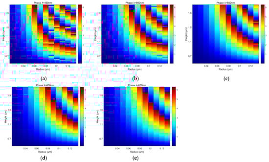 (a–e) represent the phase distributions for the meta-atom library at 450 nm, 500 nm, 550 nm, 600 nm, and 650 nm, respectively. The horizontal axis represents the radius range of the meta-atom library, while the vertical axis represents the height range of the meta-atom library.