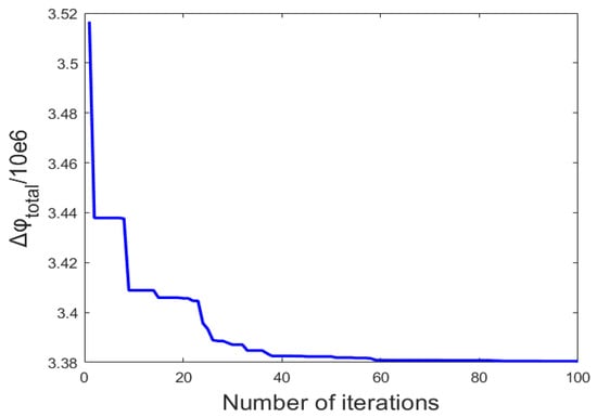where the subscript i represents all positions on the metalens, and the subscript n represents all wavelengths within the working band. φrequired is the ideal achromatic-corrected phase for each position on the metalens, and φmetalens is the actual phase generated by the metalens structure. According to the Rayleigh criterion, when the maximum wavefront aberration of an optical system is less than λ/4, the system is considered perfect. It also states that if the defective wavefront portion is small enough relative to the entire wavefront, even if this defective portion has aberration greater than λ/4, it can be ignored [13]. After 100 iterations, as shown in Figure 5, the minimum value is obtained, which represents the optimal solution.