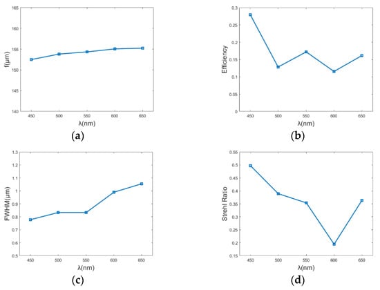 (a) Focal length; (b) Focusing efficiency; (c) FWHM values; (d) Strehl ratio.
