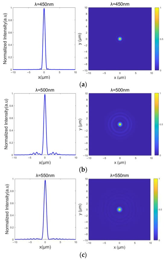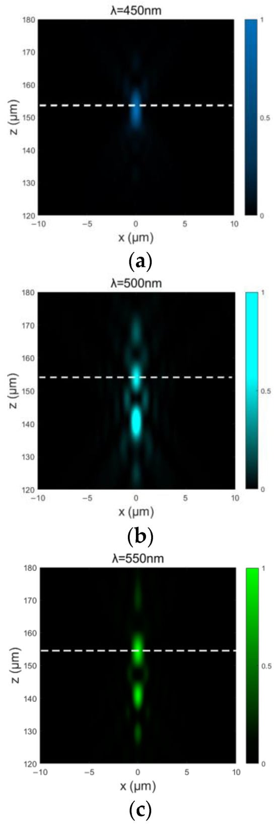 When x-polarized light in the visible spectrum (450−650 nm) is normally incident, the wavelengths of 450 nm, 500 nm, 550 nm, 600 nm, and 650 nm are selected for analysis. The designed focal length is 154 μm, and the simulated focal lengths are shown in Figure 6a, with a minimum value of 152.5 μm and a maximum value of 155.2 μm. The maximum deviation from the designed focal length is 1.5 μm, resulting in a relative error of about 1%, and the average depth of focus is about 4 μm, so the maximum error of 1.5 μm can be ignored. The normalized light intensity distribution of the focal plane (XOY plane) for normal incidence at the five wavelengths was simulated, as shown in Figure 7. Each wavelength shows strong focal spots and weak sidelobes at the focal plane. The tangents (X-axis) of the focal spots along the horizontal direction were obtained, yielding the normalized light intensity distribution curves, and the full width at half maximum (FWHM) values were measured from Figure 6c. The FWHM curve for discrete wavelengths is plotted as shown. The theoretical diffraction limit values of the FWHM for the five focal points are calculated as FWHM = λ/2NA, yielding theoretical values of 0.73 μm, 0.81 μm, 0.89 μm, 0.97 μm, and 1.05 μm for the five wavelengths. The simulated FWHM values were 0.78 μm, 0.83 μm, 0.84 μm, 0.99 μm, and 1.05 μm. The simulation results are in good agreement with the calculated results. The absolute efficiency is defined as the ratio of the energy within a circular area centered on the focal point with a diameter three times the FWHM to the incident light intensity. As shown in Figure 6b, the focusing efficiency of the five wavelengths can reach up to 28%, with an average focusing efficiency of about 17%. Higher focusing efficiency can be achieved by eliminating meta-atoms with low transmittance after building the meta-atom library. The calculated Strehl ratios are 0.497, 0.389, 0.354, 0.194, and 0.363, as shown in Figure 8, corresponding to wavelengths of 450 nm, 500 nm, 550 nm, 600 nm, and 650 nm, respectively, as shown in Figure 6d. Regarding the achievable bandwidth of this method, the element library constructed using silicon nitride material is limited to the visible wavelength range. To ensure effectiveness across every wavelength in the visible spectrum, it is necessary to design with densely sampled discrete wavelengths.The light field distribution for focusing, as shown in Figure 9.