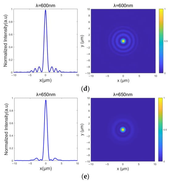 The normalized light intensity distribution of the focal plane (XOY plane) for normal incidence (right) and the normalized light intensity distribution along the horizontal tangent of the focal point (left). (a–e) correspond to wavelengths of 450 nm, 500 nm, 550 nm, 600 nm, and 650 nm, respectively.