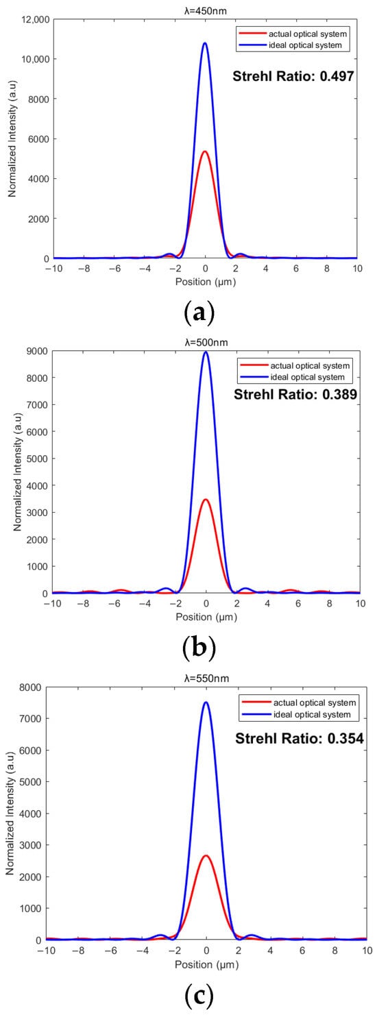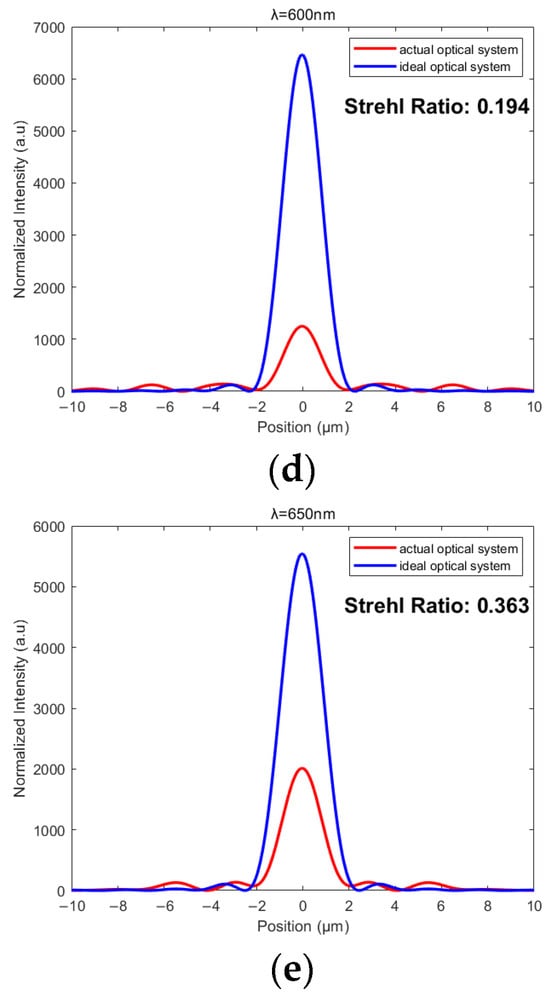 Strehl ratios for different wavelengths. (a–e) correspond to wavelengths of 450 nm, 500 nm, 550 nm, 600 nm, and 650 nm, respectively. The red line represents the PSF of the actual optical system, and the blue line represents the PSF of the ideal optical system.