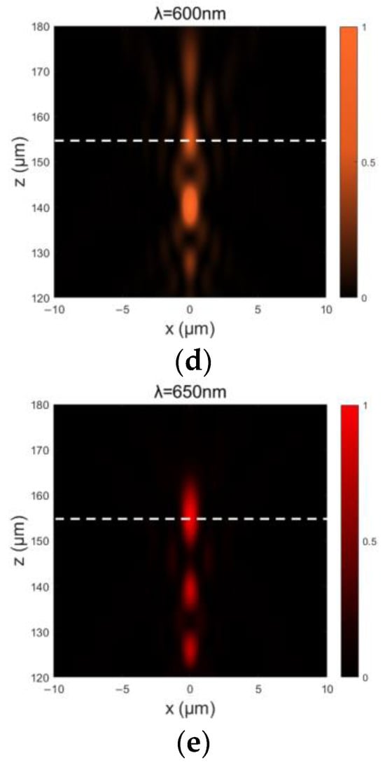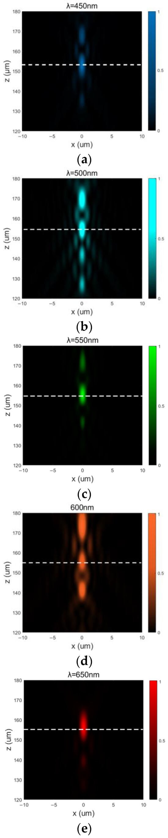 (a–e) correspond to wavelengths of 450 nm, 500 nm, 550 nm, 600 nm, and 650 nm, respectively, showing the light field distribution for focusing. The white line indicates the target focal distance along the z-direction.