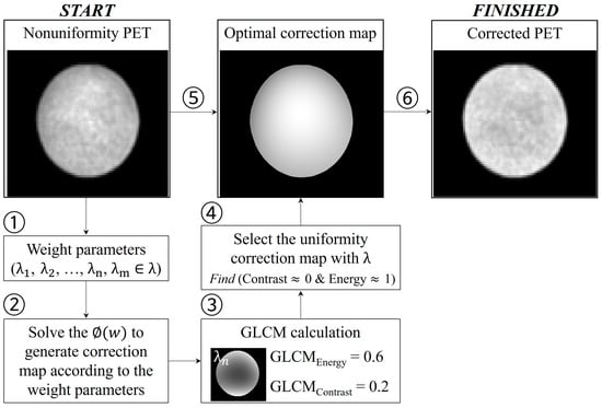 Simplified flowchart of the uniformity correction using the weight parameter optimization with the gray-level co-occurrence matrix (GLCM) in the positron emission tomography (PET) image. Here, the closer GLCMcontrast was to 0 and GLCMenergy was to 1, the higher the uniformity of the PET image slice.