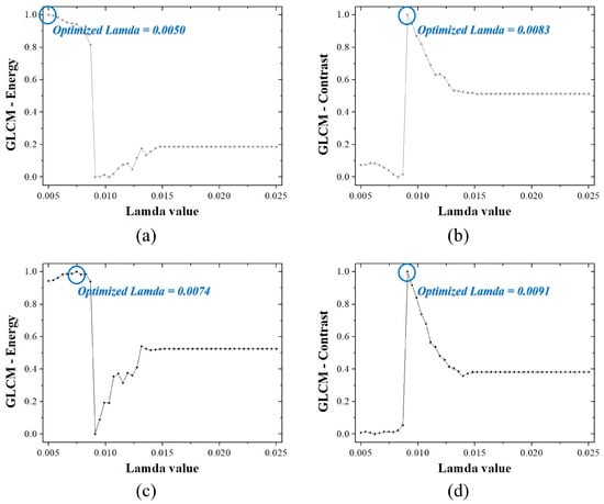 Graph for deriving the optimal solution of the GLCM algorithm’s lambda value: results in terms of (a) energy and (b) contrast using a NaCl solution phantom, and results in terms of (c) energy and (d) contrast using a NaCl + NiSO4 solution phantom.