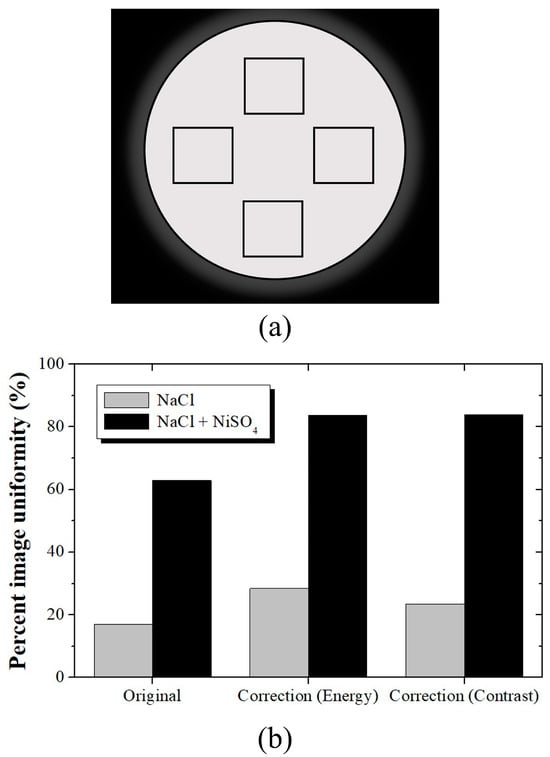 To analyze the quantitative uniformity values, the PIU was calculated, the ROI was set as shown in Figure 4a, and the average value is shown in Figure 4b. The PIU values for PET images using the NaCl phantom were calculated to be 16.99, 28.48, and 23.53 for the original, GLCM-energy-based corrected, and GLCM-contrast-based corrected images, respectively. The average PIU value of the PET images using the NaCl phantom for which uniformity was performed using the optimized GLCM algorithm was 26.01, and we confirmed that this value was improved by approximately 53.11% compared with the original image. In addition, the PIU values for PET images using the NaCl + NiSO4 phantom were calculated to be 62.86, 83.72, and 83.81 for the original, GLCM-energy-based corrected, and GLCM-contrast-based corrected images, respectively. The average PIU value of the PET images using the NaCl + NiSO4 phantom, for which uniformity was performed using the optimized GLCM algorithm, was derived to be 83.76, and we confirmed that this value was improved by approximately 33.24% compared with the original image.