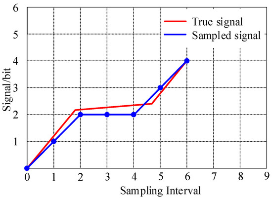 Sources of digitized noise. The difference between the actual signal and the sampled signal at each data point is demonstrated. This error can be approximately considered equivalent to the peak-to-peak detector noise of 1/2 bit.