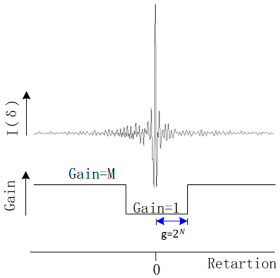 In order to more thoroughly sample the signals on both flanks of the IR interferogram, more and more instruments are using sampling of ADC gain switching to increase the dynamic range of interferogram sampling. As shown in Figure 2, the gain is switched once for g = 2N (N is an integer) data points on both sides of the ZPD position, and the gain at positions away from the ZPD is usually amplified by more than 8 times that at the ZPD position. Therefore, the principal ZPD position data are amplified to obtain more accurate sampling.