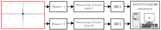 When the gain is minimized, the ADC’s dynamic range must be at least as large as the interferogram’s dynamic range. When variable gain amplification is performed on small signals, the amplified signal intensity should not exceed the intensity of the zero optical-range difference spike, lest it exceed the ADC’s dynamic range. Maximum gain can be applied to signals whose intensity is close to the RMS value. However, gain switching introduces complexities in precise synchronization control and may cause data fluctuations due to unstable control of the gain switching process. Therefore, a dual-channel interferometric data acquisition method is designed to achieve high-accuracy interferogram sampling with a high dynamic range.