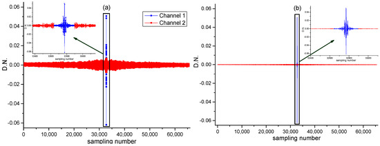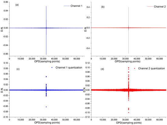 A dual-channel 16-bit ADC acquisition card with a dynamic range of −0.1 to 0.1 was simulated using MATLAB software (R2016b). A raw interferogram, used as the data input for ADC channel one, was processed without magnification (Figure 4a). The same interferogram, magnified by a factor of 8, served as the data input for ADC channel two (Figure 4b). Figure 4c,d show the quantization results of the two channels, respectively. Since channel two is primarily designed to capture small signals from the interferogram wings, gain amplification is often applied, but the amplified signal intensity must not exceed the zero optical-range difference spike intensity, otherwise, it will exceed the ADC’s dynamic range. The center region of the ZPD in channel two’s interferogram approaches the upper limit of this dynamic range.