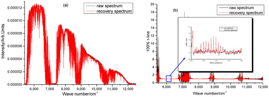 Analysis of the recovered spectral results: (a) The spectral profiles obtained by the two methods are consistent; (b) 100% of the τ-lines falling within the spectral range of 6000 to approximately 6200 cm−1.