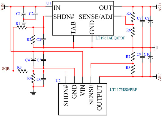 The design circuit is shown in Figure 7, with a ±15 V power supply capacity. The power supply output uses the LT1963 and LT1175 voltage regulator modules from analog devices [16], which feature very low operating current, rapid transient response, and low output noise characteristics.