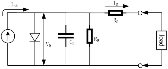 The solar-spectral ground-based FTIR system utilizes a high-performance InGaAs detector that operates within the spectral range of 0.7 µm to 1.8 µm. It is characterized by a fast rise time, stable temperature response, wide dynamic range, and high sensitivity. To enhance the performance, particularly the temperature stability of the response near the cutoff wavelength, it is necessary to utilize it in conjunction with a thermoelectrically cooled temperature controller. The equivalent circuit of an InGaAs photodiode, depicted in Figure 8, represents a photon-generating current source accompanied by a shunt resistor (RD), a shunt capacitor (CD), and a series resistor (RS). The value of RS is negligible compared to RD, except at high power levels (exceeding 10 mW). The InGaAs photodiode generates current across the PN junction when photons with sufficient energy are absorbed in its active region.