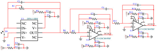 Based on the proposed dual-channel interferometric data acquisition method, the gain adjustment of the detection signal is realized, building upon the previous design of the power supply circuit and the signal detection and amplification circuit. Specifically, the detection signal is divided into multiple channels, each of which is amplified with a different gain. These channels are parallel to, and independent of, each other. The advantage of this approach is that each channel operates in parallel, eliminating the need for synchronization control.