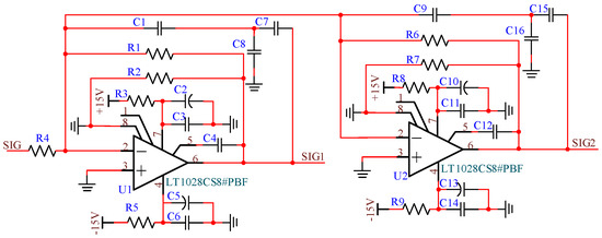 In response to the requirements of the circuit design, we have designed the two-stage synchronization circuit shown in Figure 10. The variation in gain is primarily determined by R3 and R9. To enhance the stability and reliability of the circuit, we have incorporated a T-capacitor filter to fulfill the filtering function of the method.